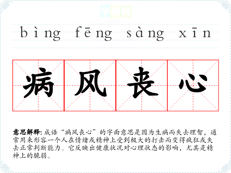 成语“病风丧心”的字面意思是因为生病而失去理智,通常用来形容一个人在情绪或精神上受到极大的打击而变得疯狂或失去正常判断能力。它反映出健康状况对心理状态的影响,尤其是精神上的脆弱。