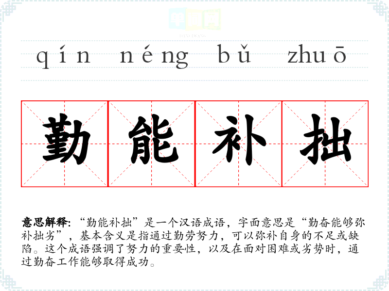 “勤能补拙”是一个汉语成语,字面意思是“勤奋能够弥补拙劣”,基本含义是指通过勤劳努力,可以弥补自身的不足或缺陷。这个成语强调了努力的重要性,以及在面对困难或劣势时,通过勤奋工作能够取得成功。