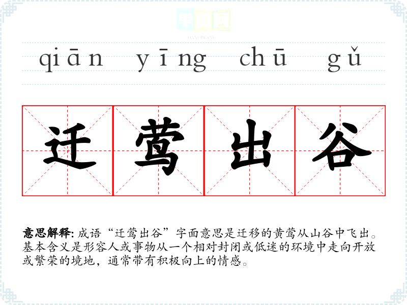 成语“迁莺出谷”字面意思是迁移的黄莺从山谷中飞出。基本含义是形容人或事物从一个相对封闭或低迷的环境中走向开放或繁荣的境地,通常带有积极向上的情感。