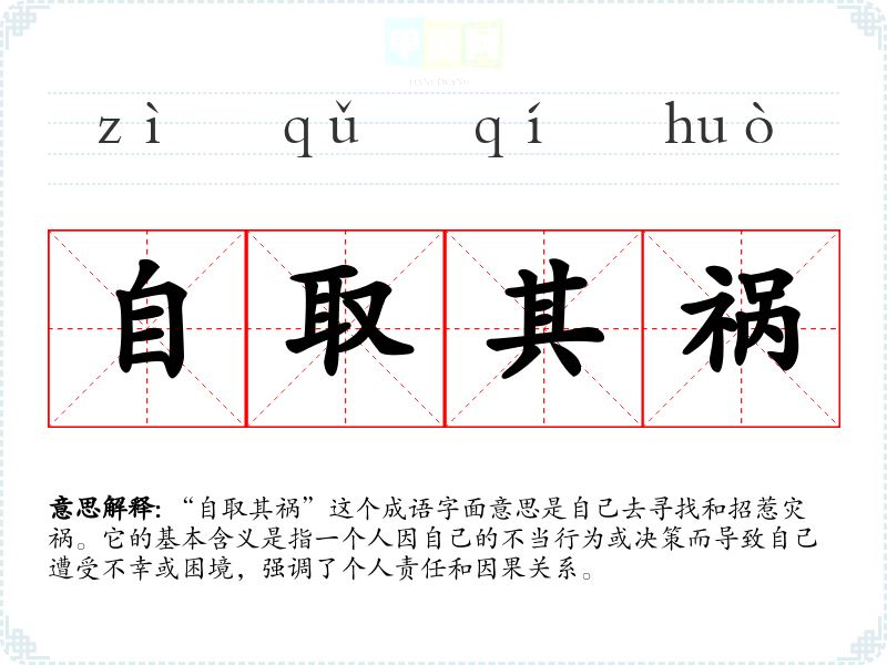 “自取其祸”这个成语字面意思是自己去寻找和招惹灾祸。它的基本含义是指一个人因自己的不当行为或决策而导致自己遭受不幸或困境,强调了个人责任和因果关系。