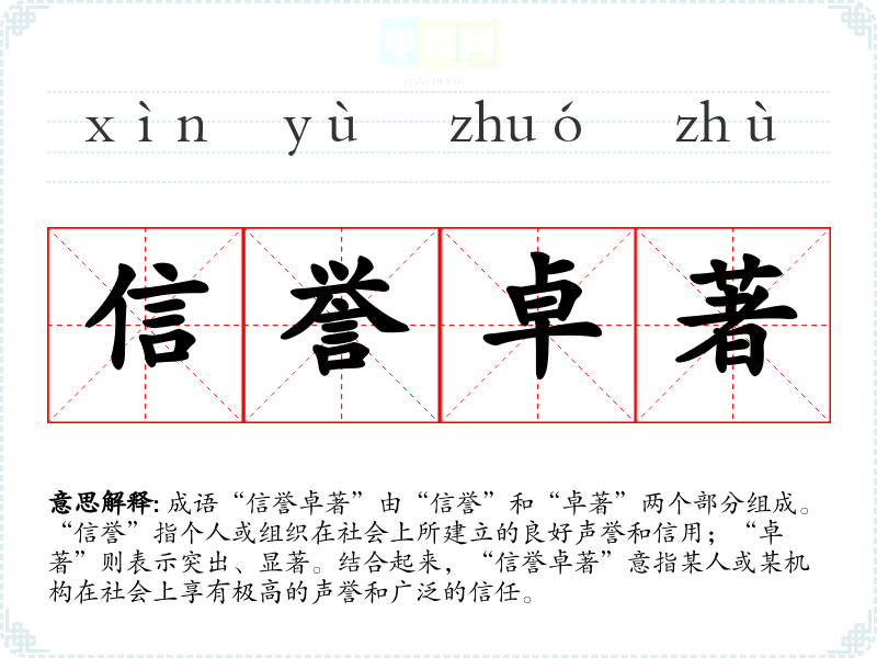 成语“信誉卓著”由“信誉”和“卓著”两个部分组成。“信誉”指个人或组织在社会上所建立的良好声誉和信用;“卓著”则表示突出、显著。结合起来,“信誉卓著”意指某人或某机构在社会上享有极高的声誉和广泛的信任。