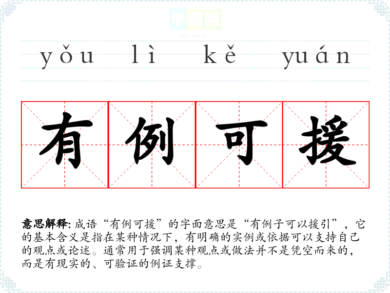 成语“有例可援”的字面意思是“有例子可以援引”,它的基本含义是指在某种情况下,有明确的实例或依据可以支持自己的观点或论述。通常用于强调某种观点或做法并不是凭空而来的,而是有现实的、可验证的例证支撑。