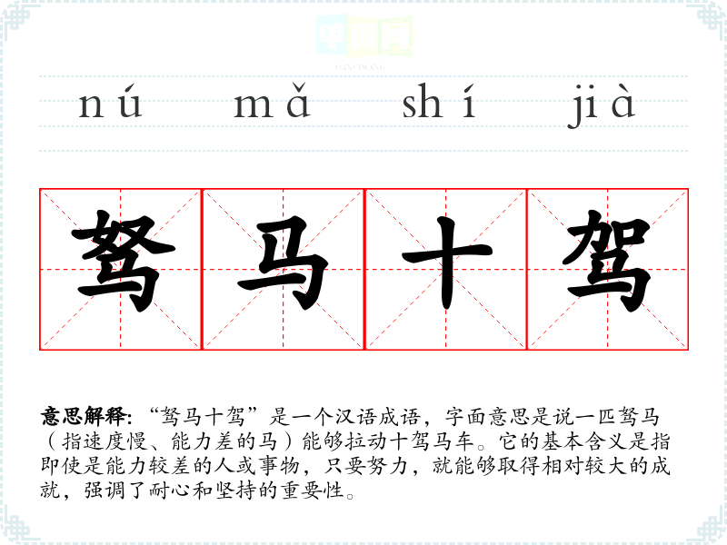 | 驽马十驾 | 原意是骏马一天的路程,驽马虽慢,但努力不懈,走十天也可以到达。比喻智力低的人只要刻苦学习,也能追上资质高的人。 |