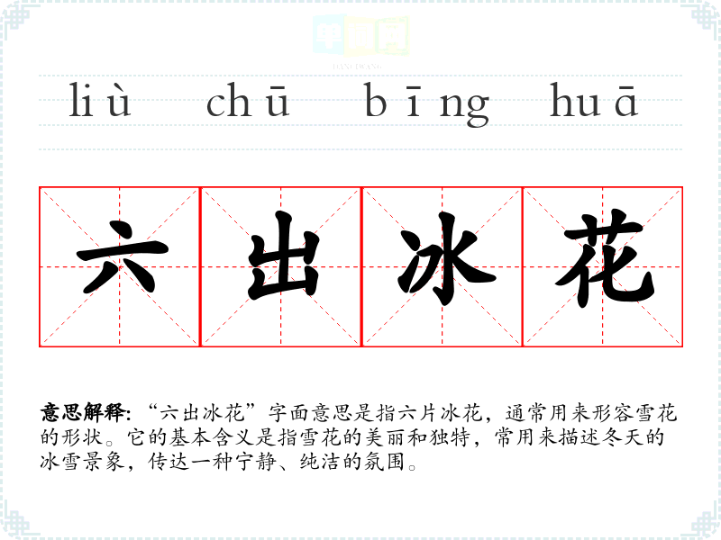 “六出冰花”字面意思是指六片冰花,通常用来形容雪花的形状。它的基本含义是指雪花的美丽和独特,常用来描述冬天的冰雪景象,传达一种宁静、纯洁的氛围。