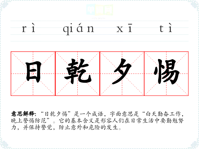 “日乾夕惕”是一个成语,字面意思是“白天勤奋工作,晚上警惕防范”。它的基本含义是形容人们在日常生活中要勤勉努力,并保持警觉,防止意外和危险的发生。