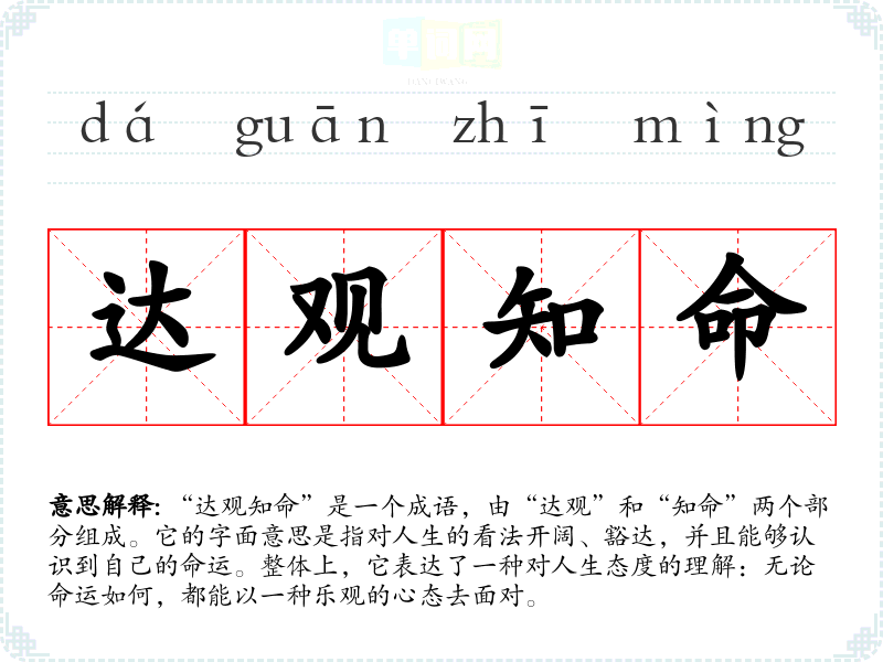 | 达官知命 | 达观:旧指一切听其自然,也指看得开。知命:旧指知天命,想念人的命运是由天决定的。指对不如意的事情看得开,任凭命运安排,无。 |