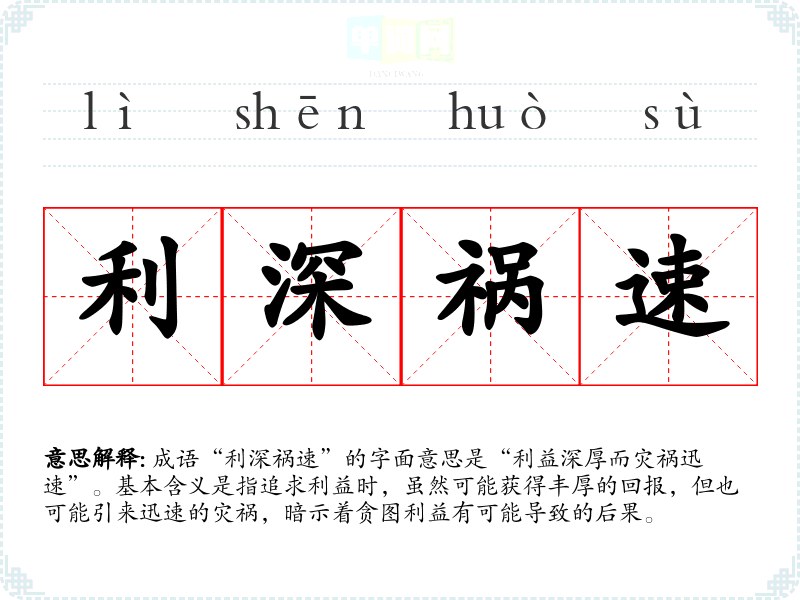 成语“利深祸速”的字面意思是“利益深厚而灾祸迅速”。基本含义是指追求利益时,虽然可能获得丰厚的回报,但也可能引来迅速的灾祸,暗示着贪图利益有可能导致的后果。