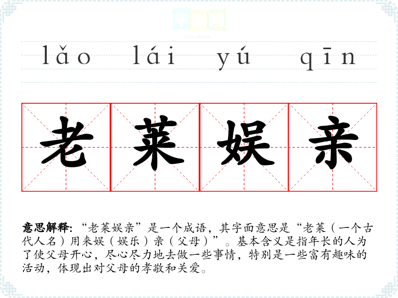 “老莱娱亲”是一个成语,其字面意思是“老莱(一个古代人名)用来娱(娱乐)亲(父母)”。基本含义是指年长的人为了使父母开心,尽心尽力地去做一些事情,特别是一些富有趣味的活动,体现出对父母的孝敬和关爱。