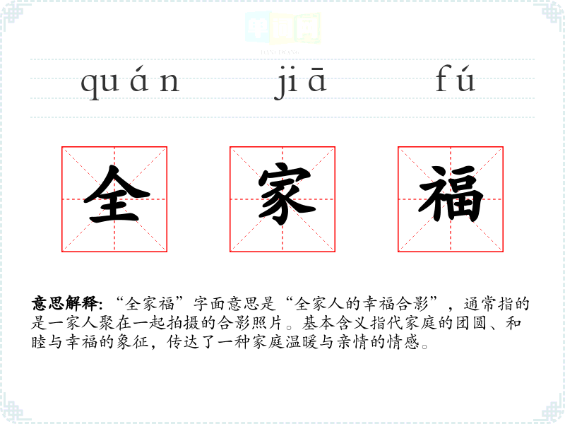 “全家福”字面意思是“全家人的幸福合影”,通常指的是一家人聚在一起拍摄的合影照片。基本含义指代家庭的团圆、和睦与幸福的象征,传达了一种家庭温暖与亲情的情感。