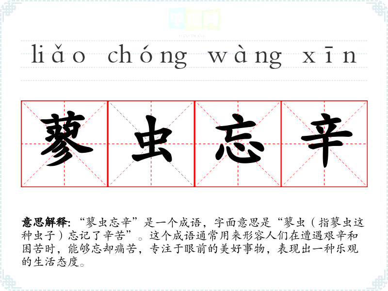 “蓼虫忘辛”是一个成语,字面意思是“蓼虫(指蓼虫这种虫子)忘记了辛苦”。这个成语通常用来形容人们在遭遇艰辛和困苦时,能够忘却痛苦,专注于眼前的美好事物,表现出一种乐观的生活态度。