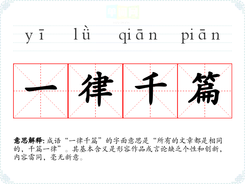 成语“一律千篇”的字面意思是“所有的文章都是相同的,千篇一律”。其基本含义是形容作品或言论缺乏个性和创新,内容雷同,毫无新意。