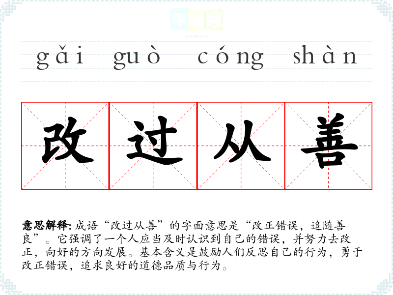 成语“改过从善”的字面意思是“改正错误,追随善良”。它强调了一个人应当及时认识到自己的错误,并努力去改正,向好的方向发展。基本含义是鼓励人们反思自己的行为,勇于改正错误,追求良好的道德品质与行为。