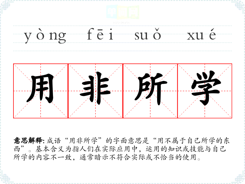 成语“用非所学”的字面意思是“用不属于自己所学的东西”。基本含义为指人们在实际应用中,运用的知识或技能与自己所学的内容不一致,通常暗示不符合实际或不恰当的使用。