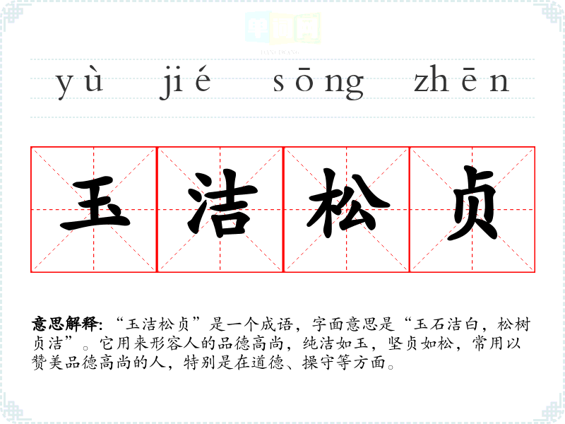 | 玉洁松贞 | 象玉一样洁净,如松一般坚贞。形容品德高尚。 |