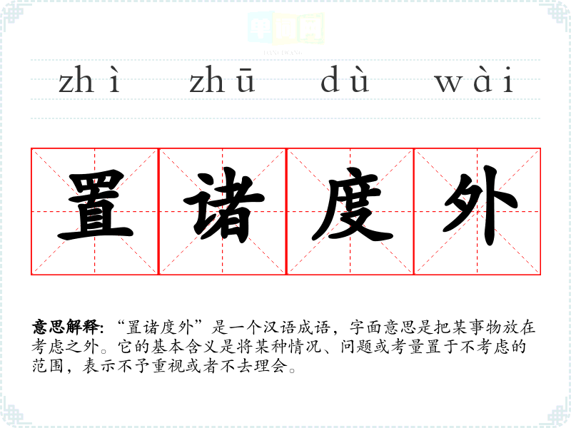 “置诸度外”是一个汉语成语,字面意思是把某事物放在考虑之外。它的基本含义是将某种情况、问题或考量置于不考虑的范围,表示不予重视或者不去理会。