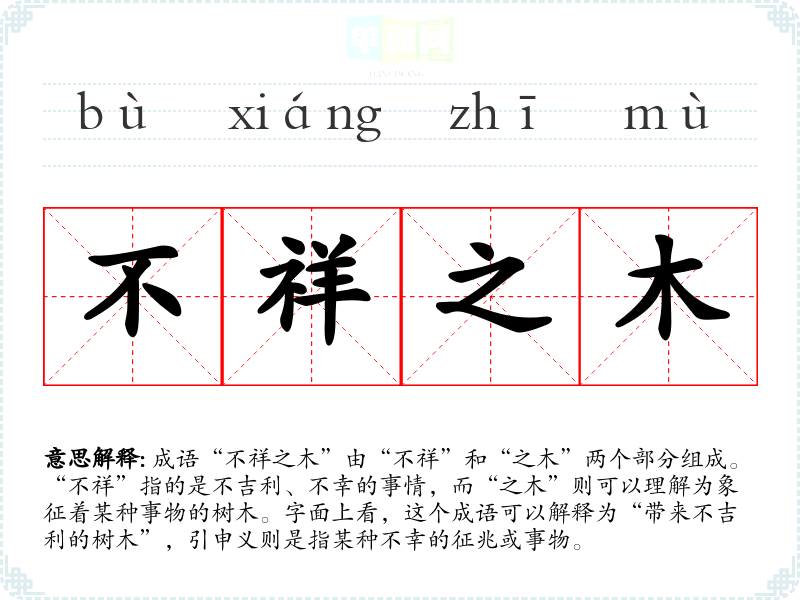 “不祥之木”并不是一个历史悠久的成语,其具体来源并不明确。在古代文献中,常常用“木”来象征生命、成长与繁荣,而“不祥”则代表着相反的负面含义。因此,可以推测这个成语可能源于对自然界的观察与人类对吉凶的文化反思。