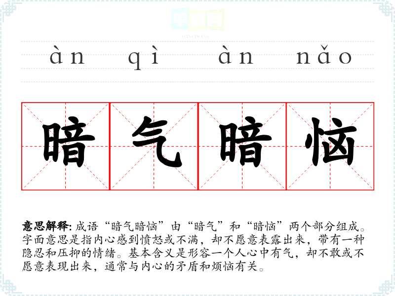 成语“暗气暗恼”由“暗气”和“暗恼”两个部分组成。字面意思是指内心感到愤怒或不满,却不愿意表露出来,带有一种隐忍和压抑的情绪。基本含义是形容一个人心中有气,却不敢或不愿意表现出来,通常与内心的矛盾和烦恼有关。