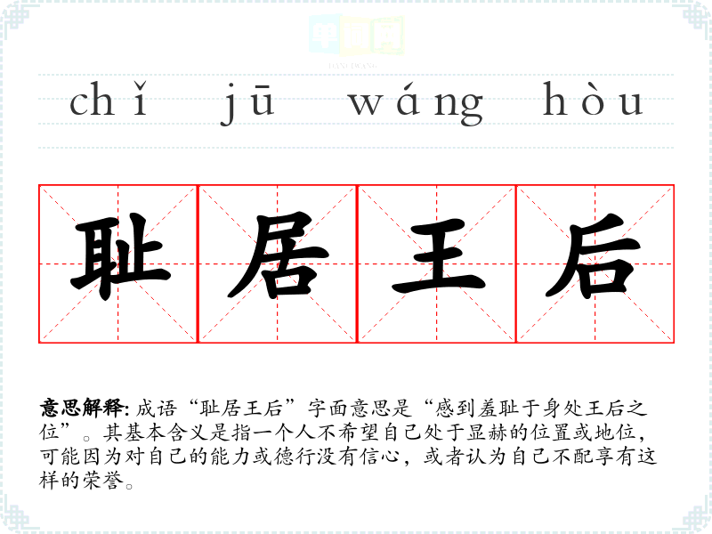 成语“耻居王后”字面意思是“感到羞耻于身处王后之位”。其基本含义是指一个人不希望自己处于显赫的位置或地位,可能因为对自己的能力或德行没有信心,或者认为自己不配享有这样的荣誉。