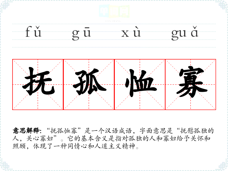 “抚孤恤寡”是一个汉语成语,字面意思是“抚慰孤独的人,关心寡妇”。它的基本含义是指对孤独的人和寡妇给予关怀和照顾,体现了一种同情心和人道主义精神。