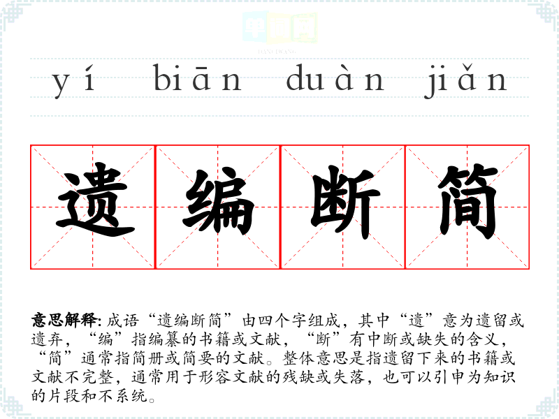 成语“遗编断简”由四个字组成,其中“遗”意为遗留或遗弃,“编”指编纂的书籍或文献,“断”有中断或缺失的含义,“简”通常指简册或简要的文献。整体意思是指遗留下来的书籍或文献不完整,通常用于形容文献的残缺或失落,也可以引申为知识的片段和不系统。
