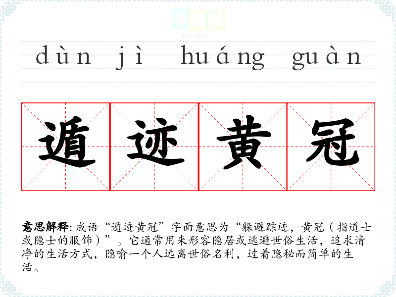 成语“遁迹黄冠”字面意思为“躲避踪迹,黄冠(指道士或隐士的服饰)”。它通常用来形容隐居或逃避世俗生活,追求清净的生活方式,隐喻一个人远离世俗名利,过着隐秘而简单的生活。