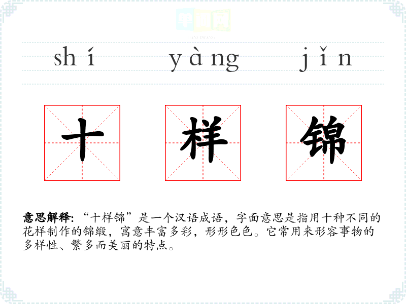 | 十样锦 | 原指十种锦绣。后指杂取各种不同样式、颜色的物品搭配在一起。也用以形容十不全。 |