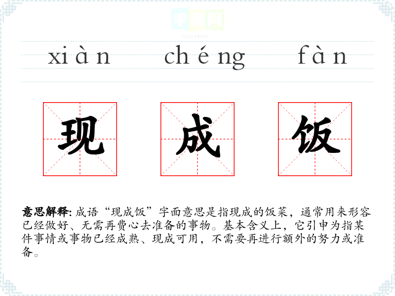 成语“现成饭”字面意思是指现成的饭菜,通常用来形容已经做好、无需再费心去准备的事物。基本含义上,它引申为指某件事情或事物已经成熟、现成可用,不需要再进行额外的努力或准备。