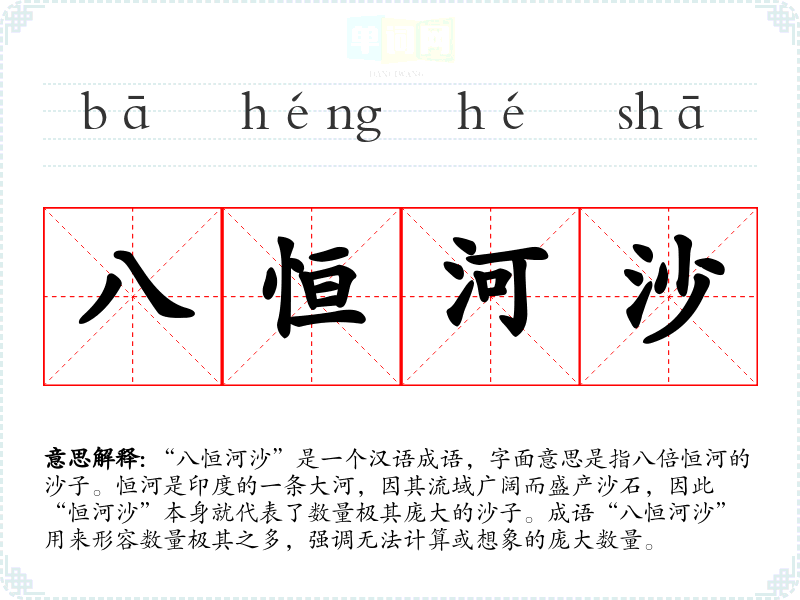 在传统文化中,数字常常被赋予特殊的意义,如“八”在文化中通常寓意着吉利和繁荣。因此,“八恒河沙”不仅强调数量庞大,同时也蕴含了对繁荣和富饶的美好期望。在现代社会,这个成语仍然适用于形容数字庞大的现象,尤其在数据化时代,面对海量信息时更为常见。