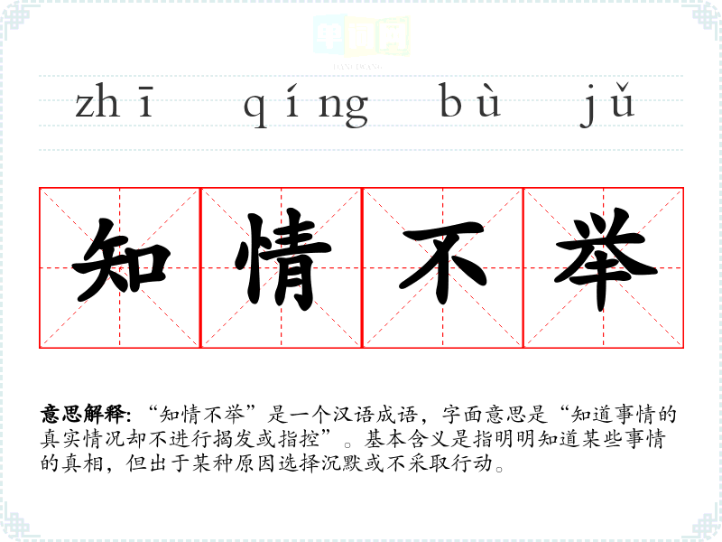 “知情不举”是一个汉语成语,字面意思是“知道事情的真实情况却不进行揭发或指控”。基本含义是指明明知道某些事情的真相,但出于某种原因选择沉默或不采取行动。