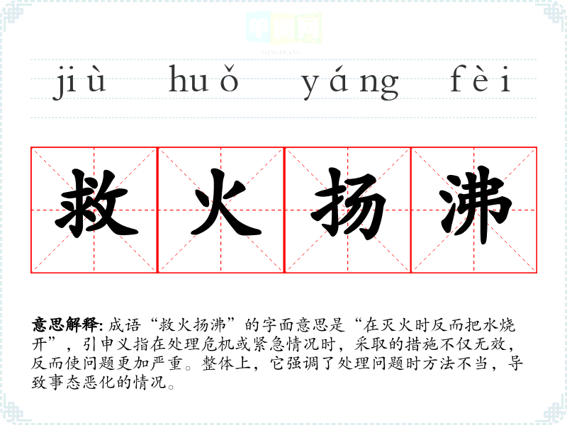 成语“救火扬沸”的字面意思是“在灭火时反而把水烧开”,引申义指在处理危机或紧急情况时,采取的措施不仅无效,反而使问题更加严重。整体上,它强调了处理问题时方法不当,导致事态恶化的情况。