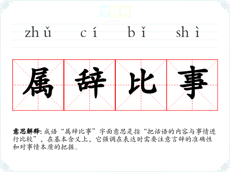 成语“属辞比事”字面意思是指“把话语的内容与事情进行比较”,在基本含义上,它强调在表达时需要注意言辞的准确性和对事情本质的把握。