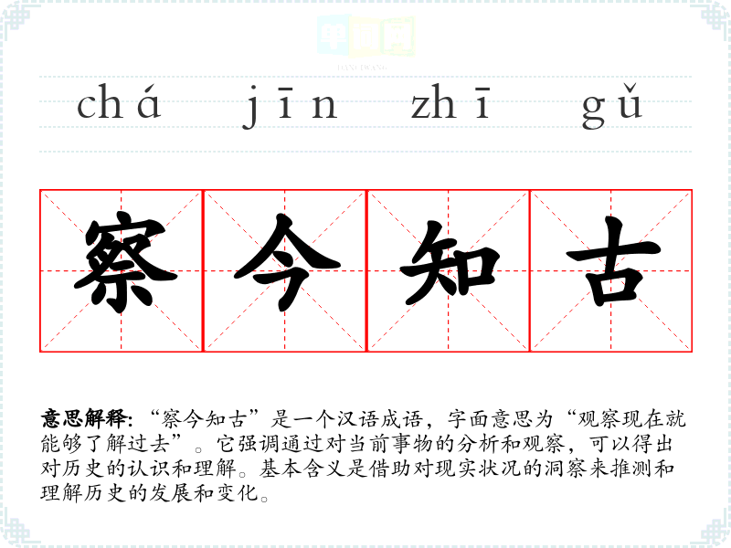 “察今知古”是一个汉语成语,字面意思为“观察现在就能够了解过去”。它强调通过对当前事物的分析和观察,可以得出对历史的认识和理解。基本含义是借助对现实状况的洞察来推测和理解历史的发展和变化。