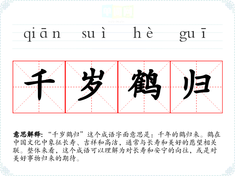 “千岁鹤归”并没有明确的历史背景或典故,可能是对“千岁”和“鹤”的组合使用,反映了古人对长寿和美好生活的追求。鹤在古代诗词中常常被用作长寿的象征,因此这个成语也可以看作是对古代文化的继承与发扬。
