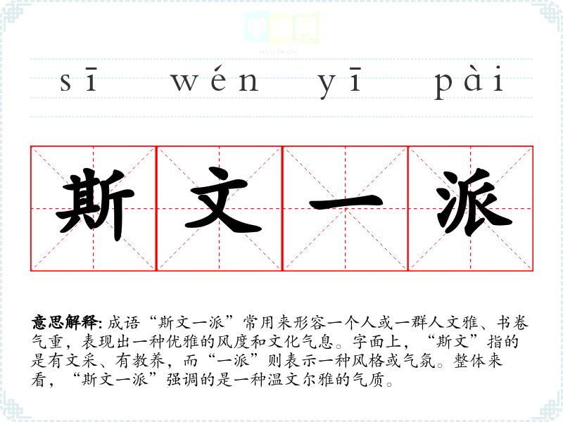 成语“斯文一派”常用来形容一个人或一群人文雅、书卷气重,表现出一种优雅的风度和文化气息。字面上,“斯文”指的是有文采、有教养,而“一派”则表示一种风格或气氛。整体来看,“斯文一派”强调的是一种温文尔雅的气质。