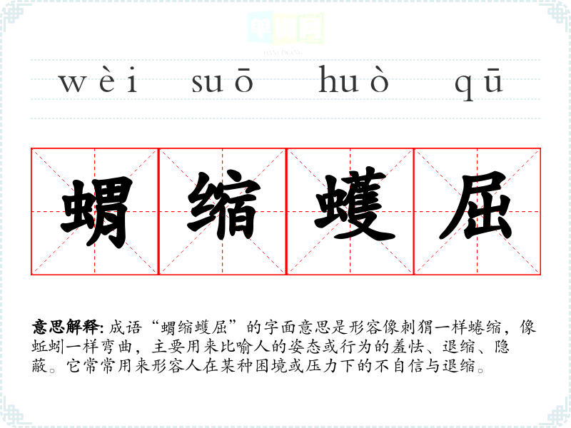 成语“蝟缩蠖屈”的字面意思是形容像刺猬一样蜷缩,像蚯蚓一样弯曲,主要用来比喻人的姿态或行为的羞怯、退缩、隐蔽。它常常用来形容人在某种困境或压力下的不自信与退缩。