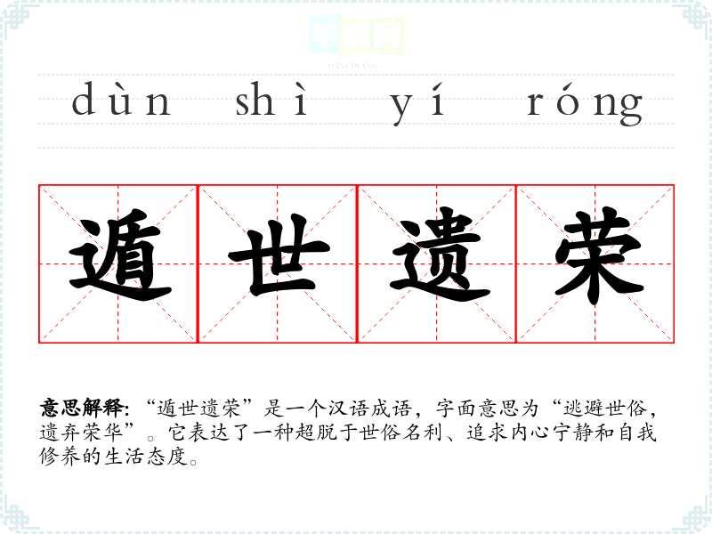 “遁世遗荣”是一个汉语成语,字面意思为“逃避世俗,遗弃荣华”。它表达了一种超脱于世俗名利、追求内心宁静和自我修养的生活态度。