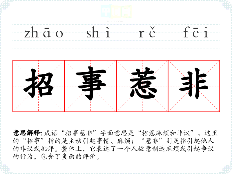 成语“招事惹非”字面意思是“招惹麻烦和非议”。这里的“招事”指的是主动引起事情、麻烦;“惹非”则是指引起他人的非议或批评。整体上,它表达了一个人故意制造麻烦或引起争议的行为,包含了负面的评价。