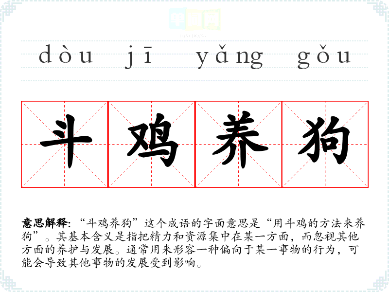 “斗鸡养狗”这个成语的字面意思是“用斗鸡的方法来养狗”。其基本含义是指把精力和资源集中在某一方面,而忽视其他方面的养护与发展。通常用来形容一种偏向于某一事物的行为,可能会导致其他事物的发展受到影响。
