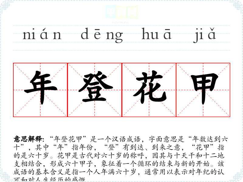 - 文学作品:在诗词中,常用“年登花甲”来表达对人生的感慨,例如描绘老年人的阅历与智慧。