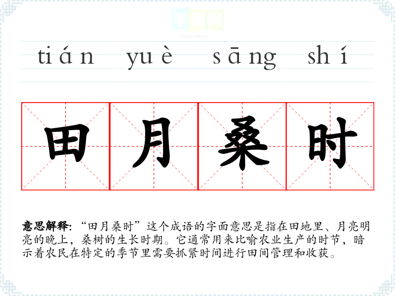 “田月桑时”这个成语的字面意思是指在田地里、月亮明亮的晚上,桑树的生长时期。它通常用来比喻农业生产的时节,暗示着农民在特定的季节里需要抓紧时间进行田间管理和收获。