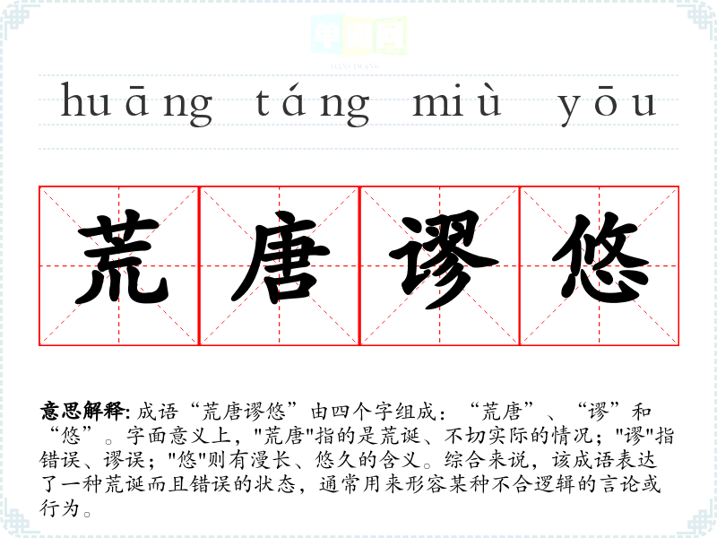 | 荒唐谬悠 | 谬悠:荒唐无稽。指说话没有根据或行为不合常理。 |