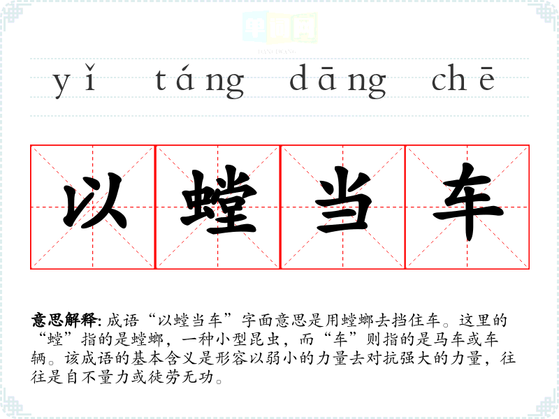 | 以螳挡车 | 用螳螂的胳膊来阻挡车轮前进。比喻自不量力 |