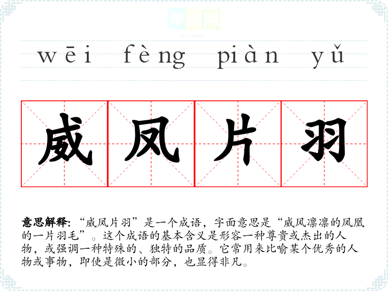 - 文学作品:在古典诗词中,常用来形容杰出的人物或作品。例如:“此书如同威凤片羽,虽小却极具智慧。”