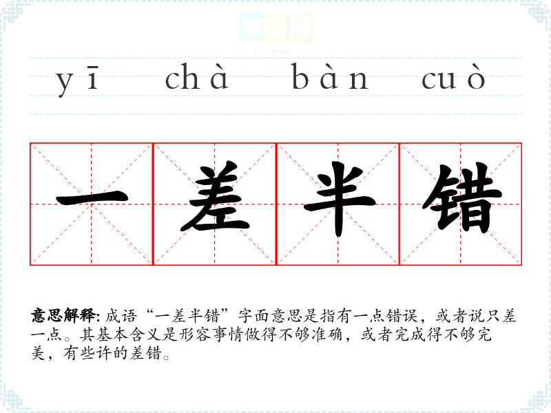 成语“一差半错”字面意思是指有一点错误,或者说只差一点。其基本含义是形容事情做得不够准确,或者完成得不够完美,有些许的差错。