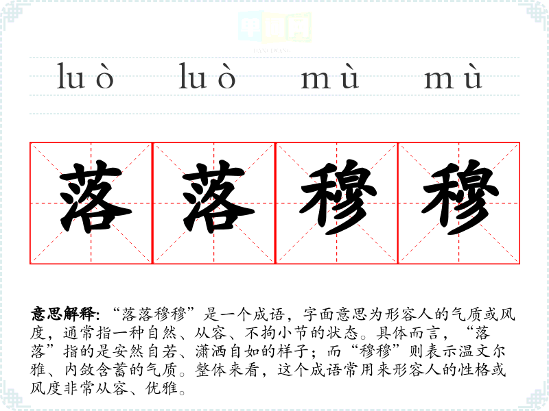“落落穆穆”是一个成语,字面意思为形容人的气质或风度,通常指一种自然、从容、不拘小节的状态。具体而言,“落落”指的是安然自若、潇洒自如的样子;而“穆穆”则表示温文尔雅、内敛含蓄的气质。整体来看,这个成语常用来形容人的性格或风度非常从容、优雅。