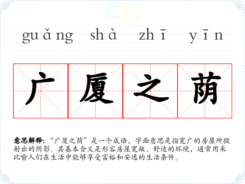 “广厦之荫”是一个成语,字面意思是指宽广的房屋所投射出的阴影。其基本含义是形容房屋宽敞、舒适的环境,通常用来比喻人们在生活中能够享受富裕和安逸的生活条件。