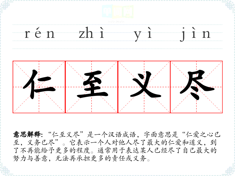 “仁至义尽”是一个汉语成语,字面意思是“仁爱之心已至,义务已尽”。它表示一个人对他人尽了最大的仁爱和道义,到了不再能给予更多的程度。通常用于表达某人已经尽了自己最大的努力与善意,无法再承担更多的责任或义务。