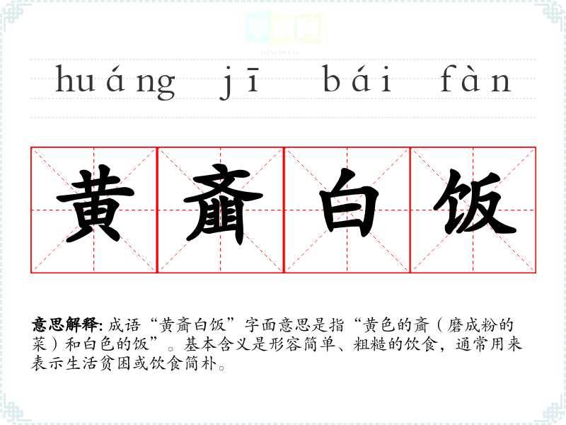 成语“黄齑白饭”字面意思是指“黄色的齑(磨成粉的菜)和白色的饭”。基本含义是形容简单、粗糙的饮食,通常用来表示生活贫困或饮食简朴。