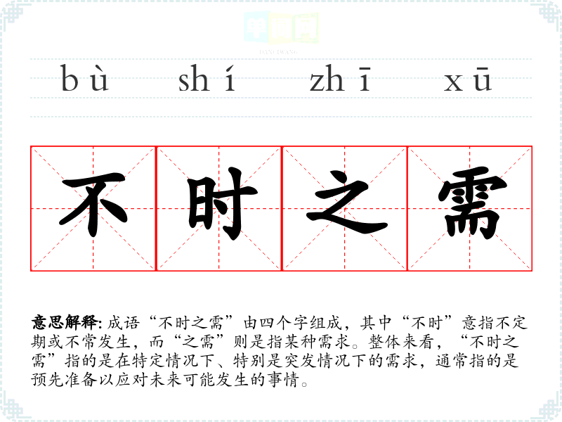 成语“不时之需”由四个字组成,其中“不时”意指不定期或不常发生,而“之需”则是指某种需求。整体来看,“不时之需”指的是在特定情况下、特别是突发情况下的需求,通常指的是预先准备以应对未来可能发生的事情。