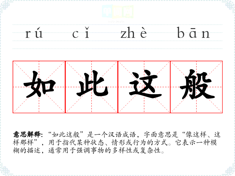 “如此这般”是一个汉语成语,字面意思是“像这样、这样那样”,用于指代某种状态、情形或行为的方式。它表示一种模糊的描述,通常用于强调事物的多样性或复杂性。